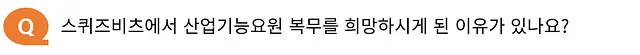 복무 기간은 현역병과 비교하면 2~3년으로 다소 긴 편입니다. 그러니 전문연구/산업기능요원 복무를 희망하시는 분들이라면 더욱 회사를 선택할 때 회사의 비전과 조직문화가 나와 잘 맞는지 신중하게 고려하셔야 해요. 그래서 스퀴즈비츠에서는 최소한의 수습기간을 통해 상호 간의 핏을 확인할 수 있는 시간을 드린 후 편입을 도와드리고 있답니다.