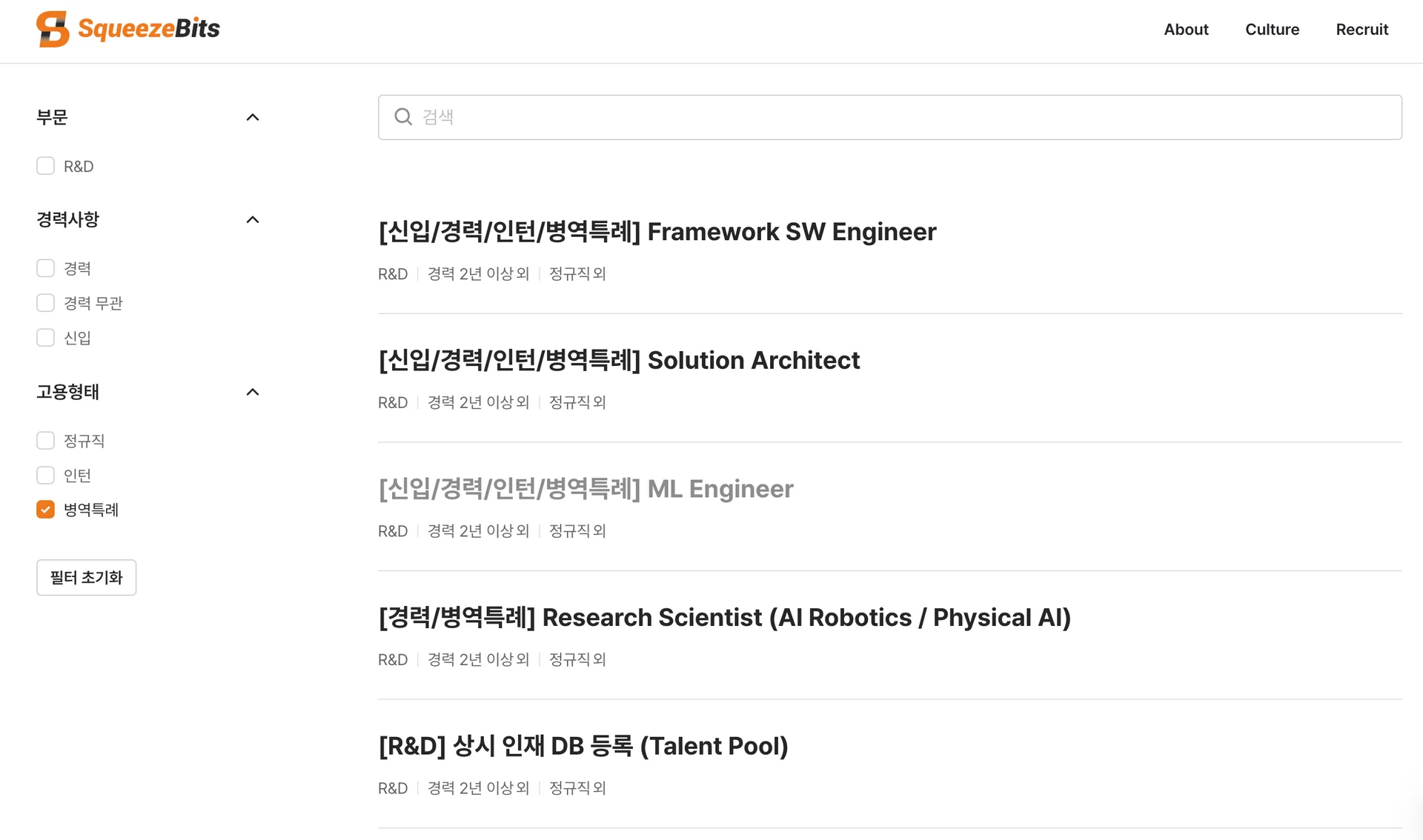 스퀴즈비츠에서 채용 중인 R&D 포지션이 반드시 석사 이상의 학위를 필요로 하지는 않아요. AI 경량화에 많은 관심을 가지고 충분한 직무 역량과 편입 자격을 보유하신 분이라면 산업기능요원으로도 지원하실 수 있습니다. 편입 자격은 학력과 현역/보충역 여부에 따라 다르니, 자세한 내용은 병무청 홈페이지에서 확인해 주세요. 🙂