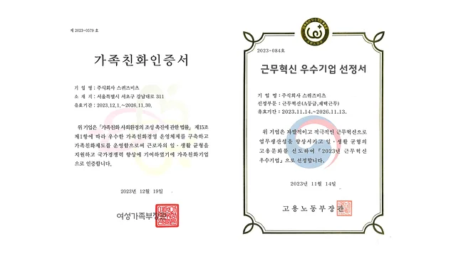 병역특례 제도가 우수한 인재를 모실 수 있는 아주 큰 메리트이다 보니, 지정업체 선정 평가를 위한 지표가 아주 많고 어려워요. 하지만 스퀴즈비츠는 설립 초창기부터 우리 팀의 우수성을 인증할 수 있는 제도들에 많은 관심을 기울이고 있었던 덕분에 높은 점수를 얻어 업체 선정의 결과까지 이루어낼 수 있었습니다. 기업부설연구소 운영, 청년내일채움공제 적극 활용, 특성화고 산학협약 체결 등… 그중에서도 특히 근무혁신 우수기업 및 가족친화기업 인증은 스퀴즈비츠의 훌륭한 복리후생 제도와 자율성 넘치는 조직문화를 방증하는 것 같으니 조금 더 자랑을 해볼게요.