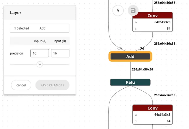 Layer 단위의 경량화 방법론을 설정할 때는 그래프에서 표시된 Input Tensor (A, B) 가 패널의 어떤 Operand (input (A), input (B))와 대응 되는지 표시했습니다. 전후에 배치된 Layer 와 모델 구조를 바탕으로 각각의 Input Tensor의 위치를 파악하면 더 정확하고 세밀한 설정이 가능합니다.