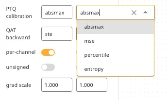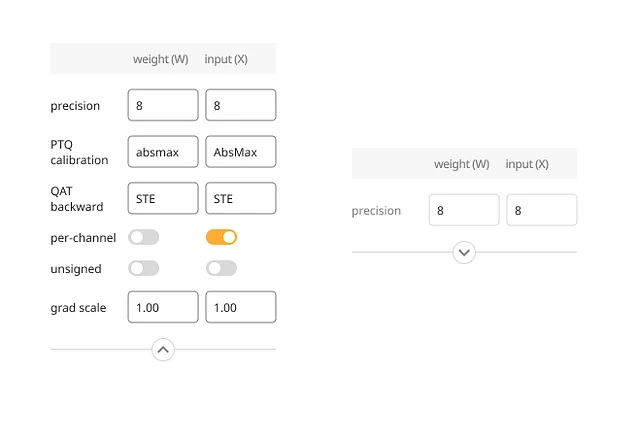 사용자는 각 Layer 가 가지는 특성을 바탕으로 수많은 경량화 방법론 중 하나를 적용할 수 있습니다. 예를 들어, 최적의 PTQ Calibration을 위해 absmax, mse, percentile과 같은 알고리즘을 각 Layer 단위로 선택해서 적용할 수 있으며, 그 외에도 QAT backward 알고리즘, per-channel quantization 여부, unsigned representation, grad-scale과 같은 configuration들이 적용될 수 있습니다.
