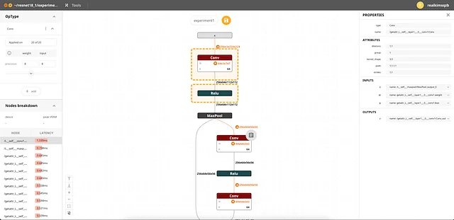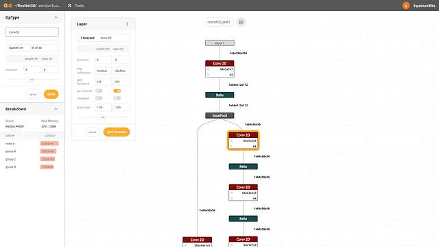 OwLite는 PyTorch-ONNX-TensorRT로 이어지는 호환성을 통해 End-to-End Latency 뿐만 아니라 TensorRT에서 측정된 fused kernel 단위의 Latency를 ONNX 구조에 매핑하여 표시하는 기능을 가지고 있습니다. 왼쪽 아래의 Breakdown 기능을 통해 사용자는 어떤 단위의 그룹이 bottleneck이 되고 있는지 알 수 있으며, 해당 영역을 클릭하면 Layer가 강조되는 기능을 통해 그 위치 또한 알 수 있습니다.