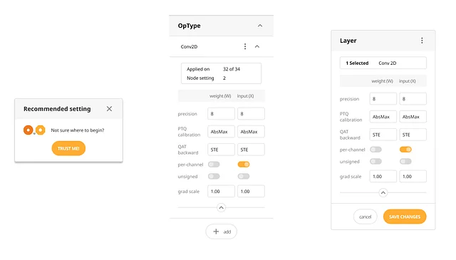 좌측에 고정된 ‘OpType Setting’을 통해, 사용자는 해당 모델의 Operator들이 어떤 설정으로 적용되어 있는지를 상시 확인할 수 있습니다. 이와 대조적으로, ‘Layer Setting’은 패널 형태가 아닌, 캔버스 위에서 사용자가 Layer를 클릭했을 때만 나타나는 형식으로 구현되었습니다. 이러한 접근은 임시적인 인터페이스를 통해 ‘OpType’과 ‘Layer Setting’ 간에 명확한 멘탈 모델을 형성하도록 돕습니다. 이는 사용자가 시스템의 작동 방식을 더 직관적으로 이해하고, 효과적으로 경량화 옵션을 적용할 수 있도록 지원합니다.