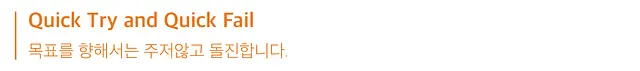 대단한 퍼포먼스는 절대 하루아침에 이루어지지 않습니다. 어떤 일이든 초입부터 넘어지기도 하고, 어쩌면 잘못된 길인 줄도 모른 채 한참 가다 보니 막다른 절벽을 맞닥뜨리게 되기도 합니다. 시행착오라는 것은 너무나 당연한 과정입니다. 그래서 우리는 처음부터 완벽한 경로를 세우는 데에 시간을 낭비하기보다는 일단 부딪혀보고 정답인지 아닌지 확인하기를 추구합니다. 잘못된 길이라면 조심히 다시 돌아가, 동료들이 같은 길에 들지 않도록 “위험” 표지판을 세우는 것 역시 소중한 성과이기 때문입니다.