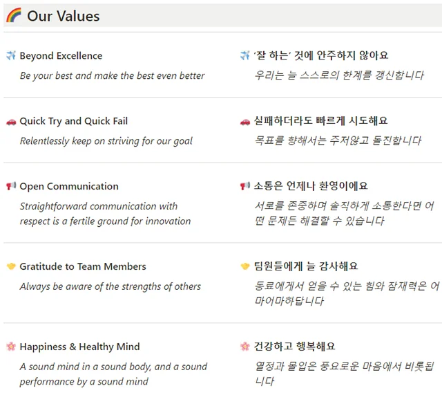 스퀴즈비츠라는 팀이 만들어지고 제일 먼저 미션과 핵심가치를 고민했던 이유입니다. 아무리 훌륭한 인재들이 모여있다 해도 우리만의 문화가 세워지지 않으면 충분한 시너지를 낼 수 없습니다. 같은 목표를 바라보고, 같은 가치관을 공유할 때 비로소 최대의 공명이 완성되는 것입니다.