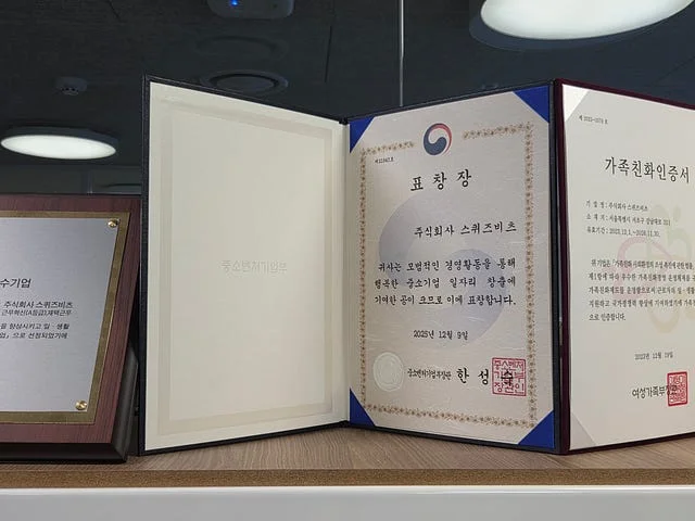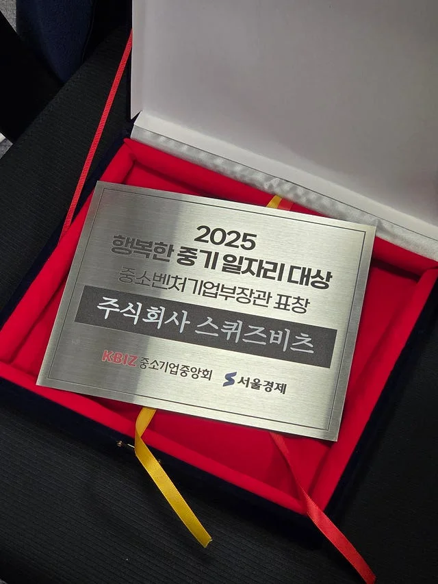안녕하세요, 스퀴즈비츠의 HR 매니저 김나은입니다. 얼마 전 스퀴즈비츠에 반가운 소식이 하나 더 생겼습니다. 바로 2025 행복한 중기 일자리 대상에서 스퀴즈비츠가 중소벤처기업부 장관 표창을 수상하게 되었는데요! 🎉 상을 받는다는 것 자체로도 즐거운 일이지만, 무엇보다 우리의 조직문화가 좋은 방향으로 나아가고 있다는 작은 확신을 얻을 수 있어 더욱 소중한 순간이었습니다.