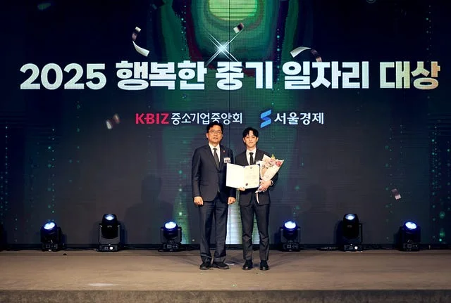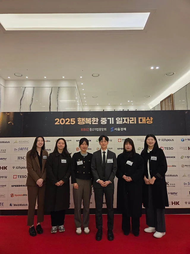 2025 행복한 중기 일자리 대상 시상식은 지난 12월 9일 여의도 중소기업중앙회에서 펼쳐졌습니다. 수상자인 대표님뿐만 아니라 스퀴즈비츠 경영전략팀원들도 함께 자리했는데요, 평소 회사의 문화와 제도를 함께 고민해 온 동료들과 같은 자리에서 영광스러운 순간을 공유했다는 점이 더더욱 의미 있는 시간으로 다가왔습니다.