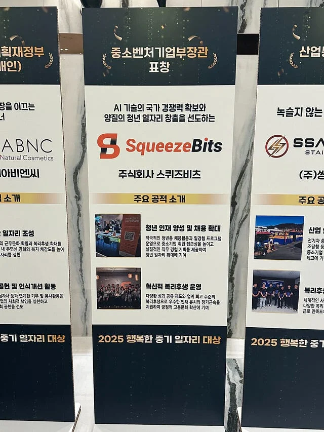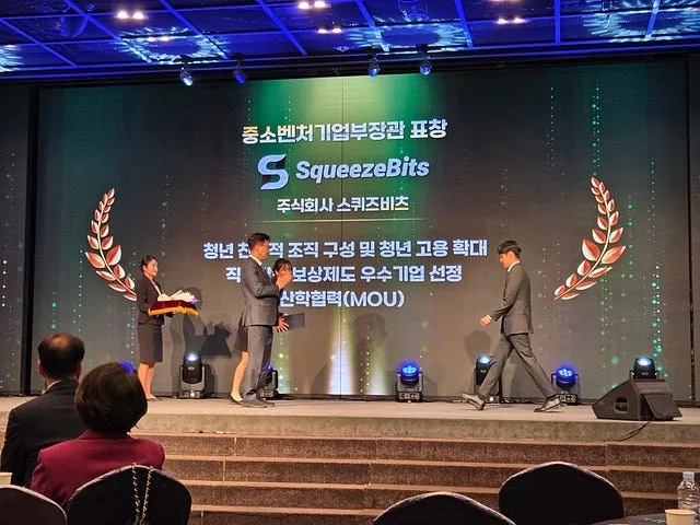 이러한 기준들은 스퀴즈비츠가 평소에 중요하게 생각해 온 방향과 맞닿아 있었기에 준비부터 수상까지 모든 과정이 더욱 의미 있게 느껴졌습니다. AI 모델 최적화라는 특수한 분야에서 우수한 인재를 발굴하고 유치하기 위해, 그리고 우리 팀을 믿고 합류한 구성원들이 스스로 실력을 키우며 다양한 도전을 이어갈 수 있도록 애써온 노력들이 긍정적으로 인정받았다는 점이 뿌듯했습니다.