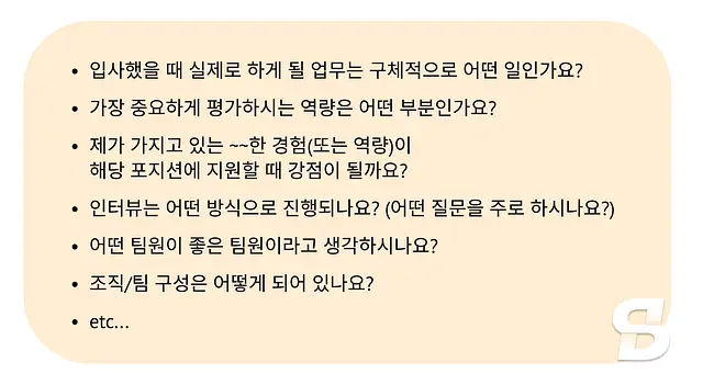 지원자분들로 하여금 모호한 부분이 없도록 명쾌한 채용 공고를 작성하는 것도 담당자의 중요한 역량이겠지요. 하지만 한정된 페이지 안에 다 담기지 않은 내용도 있을 테고, 너무나 공개적인 곳에 기재해 두기엔 어려운 내용도 있을 것입니다. 이렇게 모두가 알지는 못하는 정보를 얻음으로써 입사 지원의 꿀팁을 얻을 수 있는 자리가 바로 채용 담당자와의 상담 현장입니다. 상담 자리를 통해 직무 및 조직문화적인 핏을 확인해 보기 좋은 질문들 몇 가지를 알려드릴게요.