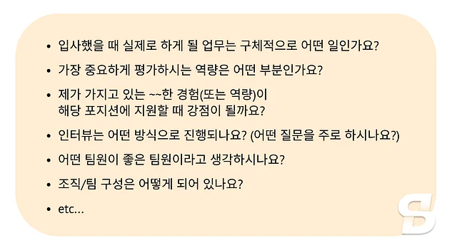 이 외에도 복리후생 구조, 연봉 정보 등 처우 관련 질문을 할 수도 있겠지만, 특히 연봉 테이블과 같이 민감한 정보는 담당자도 명확하게 말씀드리기 어려운 경우가 많습니다. 연봉 정보는 대부분 회사에서 대외비로 관리하고 있기 때문에, 정확하게 오픈하지 않는다고 해서 연봉 경쟁력이 낮은 것은 아니랍니다! 😉