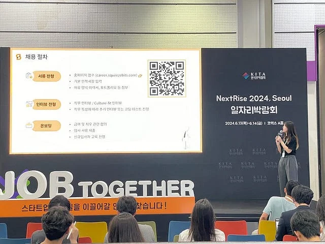 지난 6월 코엑스에서 열린 [NextRise]의 부대행사로 진행된 채용설명회 무대에서 스퀴즈비츠도 여러 분들께 인사드릴 기회가 있었어요. 상담회처럼 가까운 자리에서 소통할 시간이 없다는 점이 아쉽긴 했지만, 담당자로서 늘 강조하고 싶었던 부분들을 중심으로 자료를 구성하다 보니 30분의 설명회 시간도 너무나 짧더라구요. 준비한 이야기를 쭉 들려드리면서 어떤 부분에서 청중의 눈이 더 반짝이는지 알아보는 것 또한 소소한 즐거움과 큰 수확이었습니다. 🤩