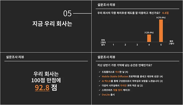 타운홀에 앞서 HR에서는 팀원분들의 솔직한 의견을 청취할 수 있는 익명 설문조사를 진행했습니다. 응답 결과를 모아 타운홀에서 공개하고, 다 같이 공감과 의견을 나누기도 했어요. 조직 문화에 대한 만족도, 우리 회사의 장점과 아쉬운 점 등에 대한 대표님의 실시간 피드백까지 함께 들을 수 있었답니다. 특히 자유로운 연차와 재택근무 사용에 대한 만족도 항목은 결과 점수가 압도적으로 높았는데요, 스퀴즈비츠에 탄탄하게 자리 잡은 ‘수평적이고 자율적인 조직문화’를 느낄 수 있었습니다. 👏