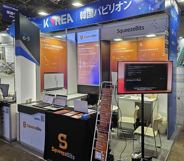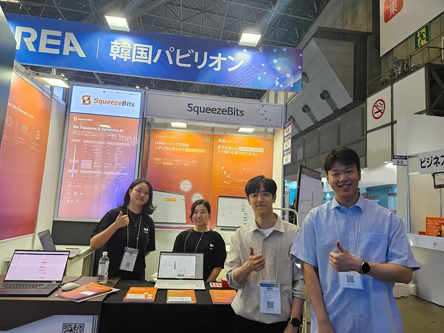 뜨거운 열기로 가득했던 도쿄 현장의 한국관 한편에서 스퀴즈비츠 부스를 만나볼 수 있었습니다. AI 모델 경량화 툴 OwLite와 LLM 서빙 시나리오 최적화 툴 Fits on Chips에 대한 소개 및 시연뿐만 아니라, Wifi를 사용하지 않고 온디바이스로 고속 동작하는 LLM 모델 데모 등 다채로운 콘텐츠를 준비해 두었습니다. AI 모델 경량화라는 기술 자체가 익숙지 않은 분들께는 경량화의 필요성과 효과를 소개해 드릴 수 있었고, 실제로 모델 경량화의 니즈가 있으신 분들께는 스퀴즈비츠만의 높은 기술 경쟁력을 선보일 수 있던 자리였습니다.